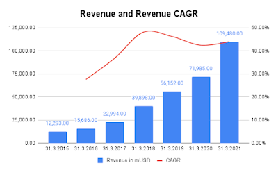Financials, for the year ended 31 March 2020 Alibaba Group made $7,90 per share (GAAP reported EPS) and they had a net margin of 27,5% ($7,90 per ADS share). The picture below is taken from Alibaba's 2020 annual report showing the revenue development, revenue has grown very fast and most likely the growth rate will decrease over time. If the revenue growth rate decreases (which I expect due to limited market size on this planet and oppositions from regulators if you are too big) then it will not be a big problem as the company shows very profitable business with a huge net profit margin. In the 2020 annual report the company displays a healthy profit since 2016 while having a solid equity ratio of 57,5% in 2020. Interesting is how fast Alibaba's cloud computing segment is growing compared to core commerce segment, personally I see a lot of potential in could business and data management in the future to support businesses even though the segment was loss making in 2020 as core commerce segment was keeping up the total result.